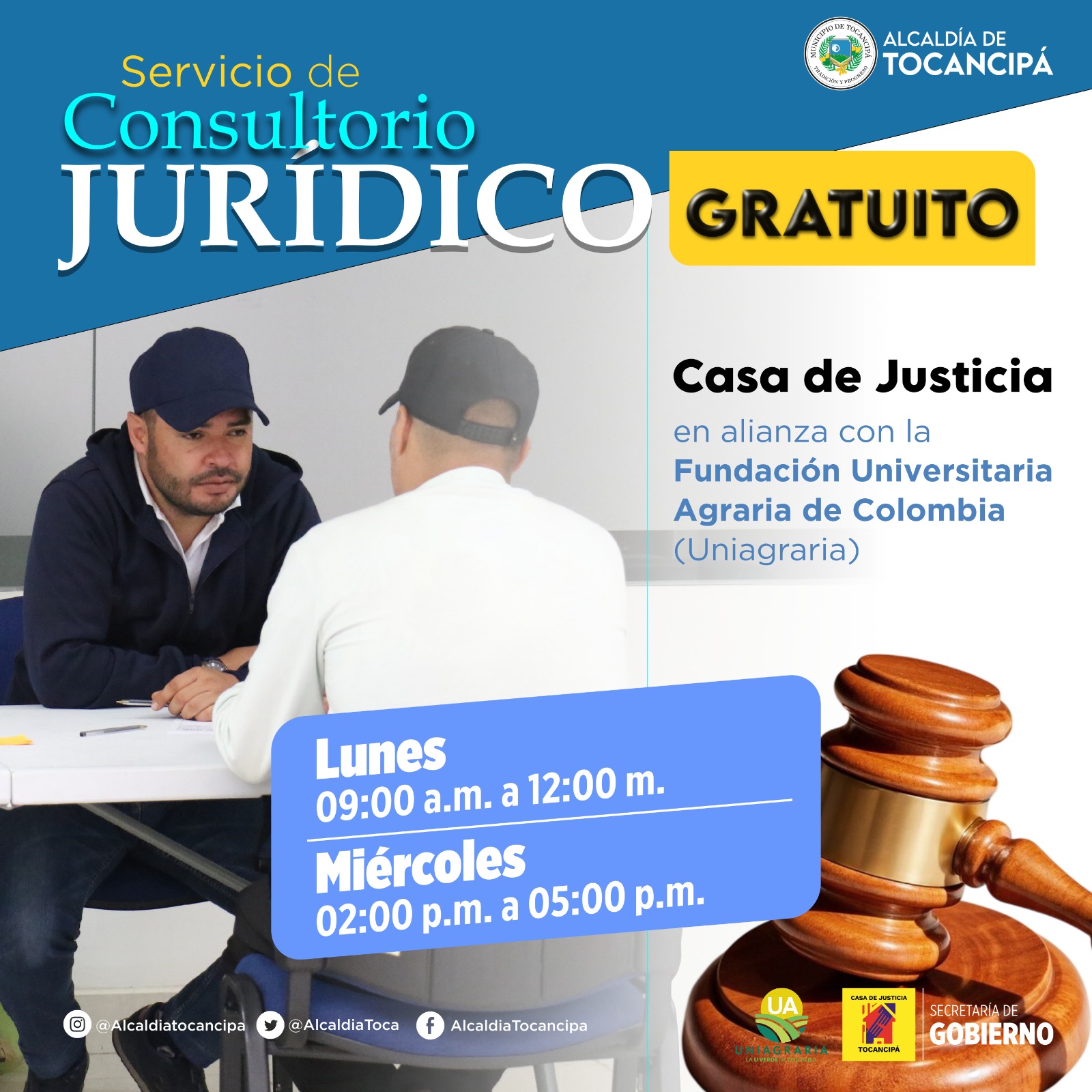 #ConsultorioGratuito I La Casa de Justicia en Tocancipá, se complace informar a la comunidad que, gracias a la alianza con la Fundación Universitaria Agraria de Colombia, y el apoyo de su área jurídica, prestará el servicio de Consultorio Jurídico Gratuito, como apoyo especial a la población más vulnerable.