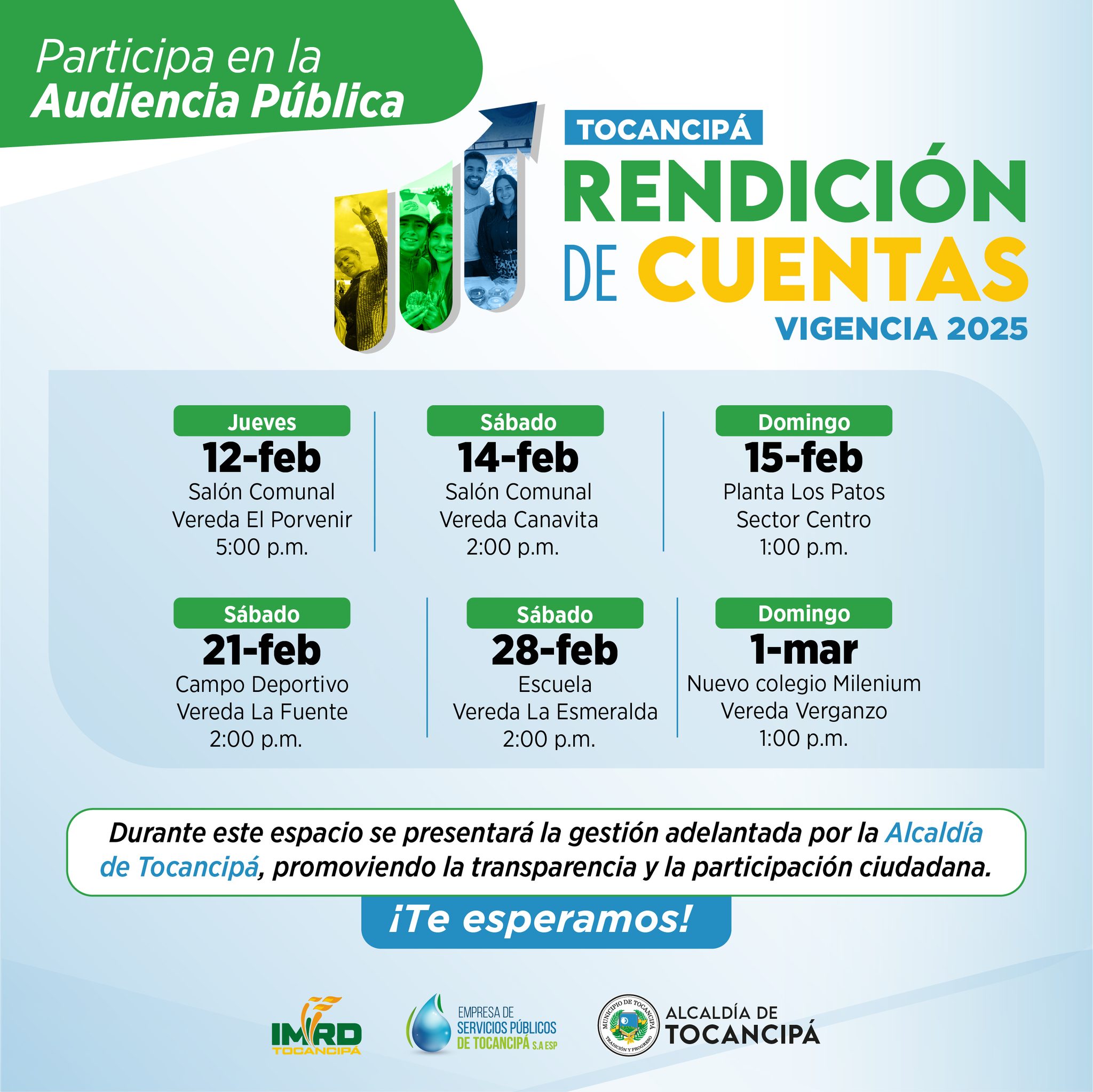 #ParticipaciónCiudadana | El alcalde Walfrando Forero Bejarano, junto a su equipo de trabajo, invita a toda la comunidad tocancipeña a participar en la Audiencia Pública de Rendición de Cuentas 2025, un espacio para dialogar, informarse y conocer los resultados de la gestión realizada durante el año.