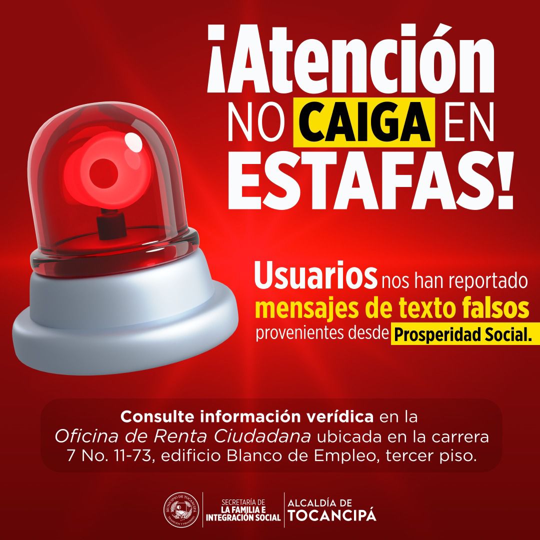#Atención | ¡Si eres beneficiario de Renta Ciudadana evita caer en estafas! Haz caso omiso a falsos mensajes de texto que supuestamente provienen de Prosperidad Social. Si tienes dudas aclaralas directamente en la Oficina de Renta Ciudadana de Tocancipá, edificio Blanco de Empleo, tercer piso.