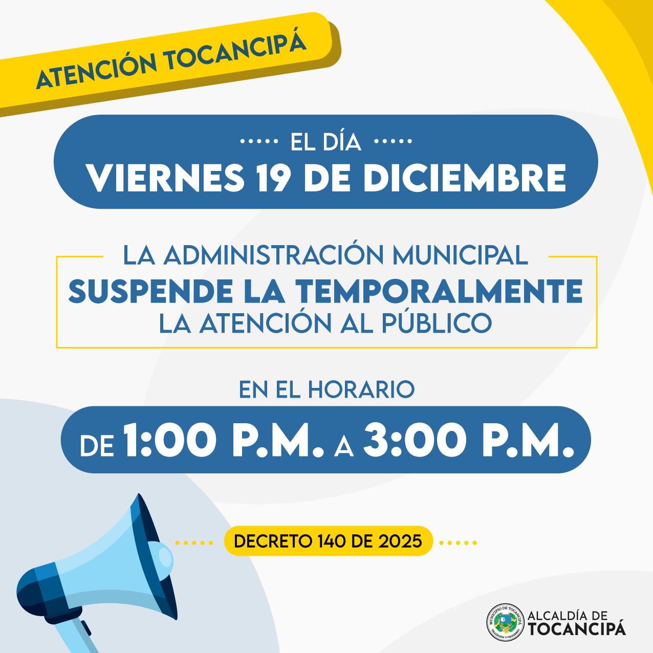 #Administrativa | Informamos a la ciudadanía, que de conformidad con el Decreto 140 de 2025, hoy viernes 19 de diciembre, se suspende la atención al público en la Alcaldía de Tocancipá y en las demás sedes administrativas.