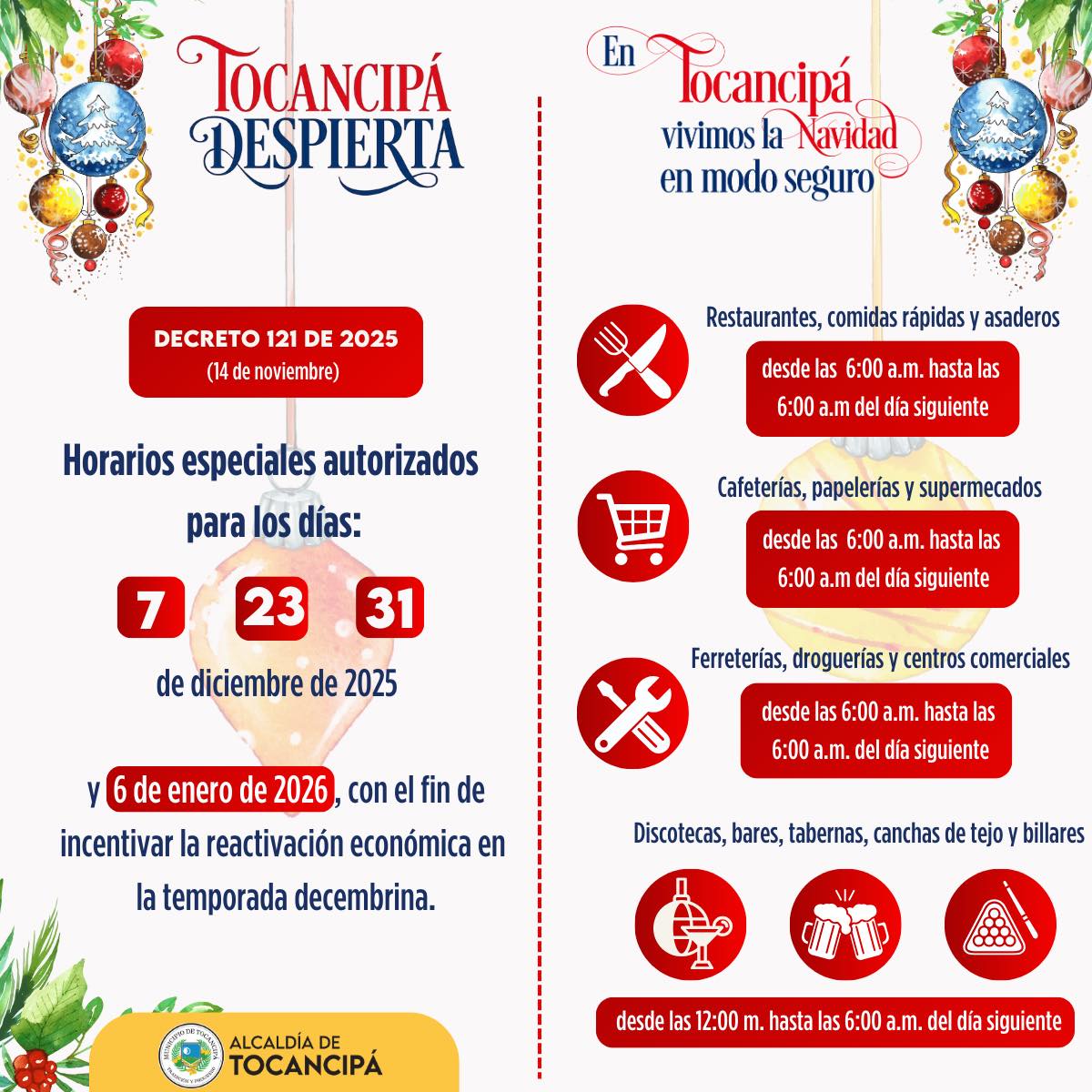 #TocancipáDespierta | Estos son los horarios especiales para la temporada decembrina, incluyendo el 6 de enero, con el fin de impulsar la reactivación económica.