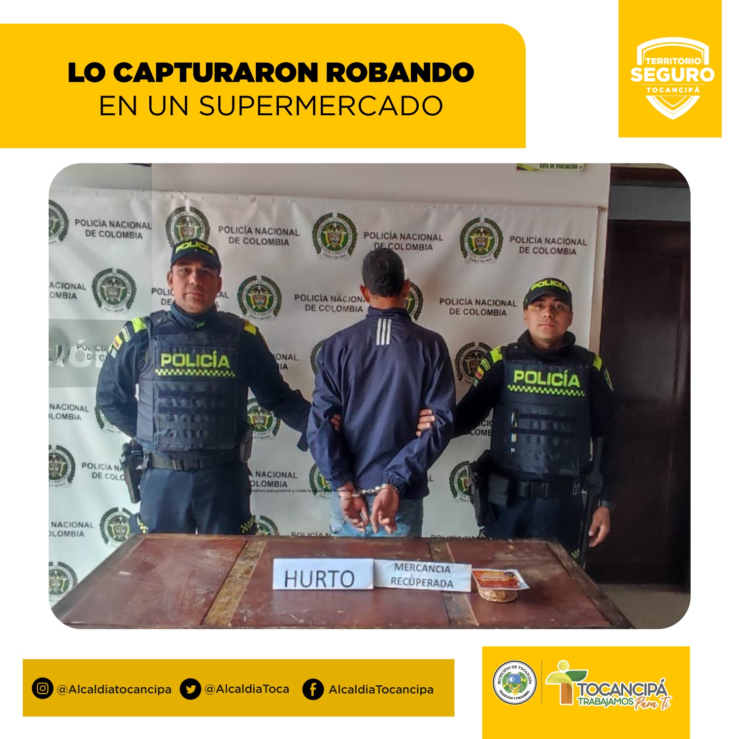 El cuadrante 4.1 de Policía de Tocancipá capturó en flagrancia a un individuo que minutos antes habría sustraído mercancía de manera ilegal de un reconocido supermercado de cadena en la vereda Verganzo. El sujeto, oriundo del departamento de Magdalena, ya fue dejado a disposición de la autoridad competente junto con la mercancía recuperada.
