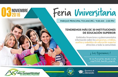 El alcalde Walfrando Forero Bejarano, la Secretaría de Educación y el Concejo Municipal tienen el gusto de invitar a la comunidad a la Feria Universitaria que se realizará mañana jueves 3 de noviembre en el Parque Principal de 9:00 a.m. a 2:00 p.m.