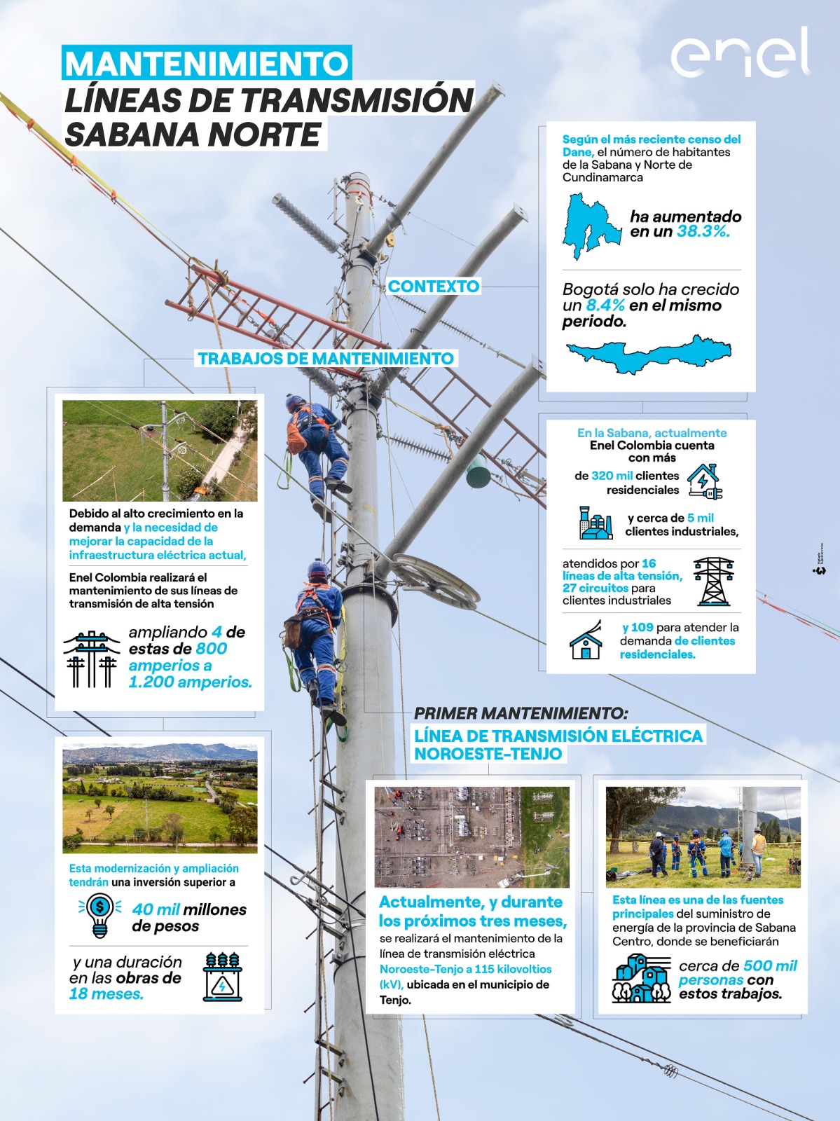 Actualmente, estamos realizando el mantenimiento de la línea de transmisión eléctrica Noroeste-Tenjo, la cual es una de las fuentes principales del suministro de energía de la provincia de Sabana Centro, donde se beneficiarán cerca de 500.000 personas.