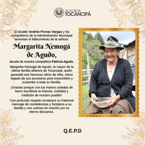Nuestro alcalde Andrés Porras y la Administración Municipal expresan su sentimiento de condolencias, ante la partida de la sra Margarita Nemogá de Agudo, la mayor de la última familia alfarera de Tocancipá.