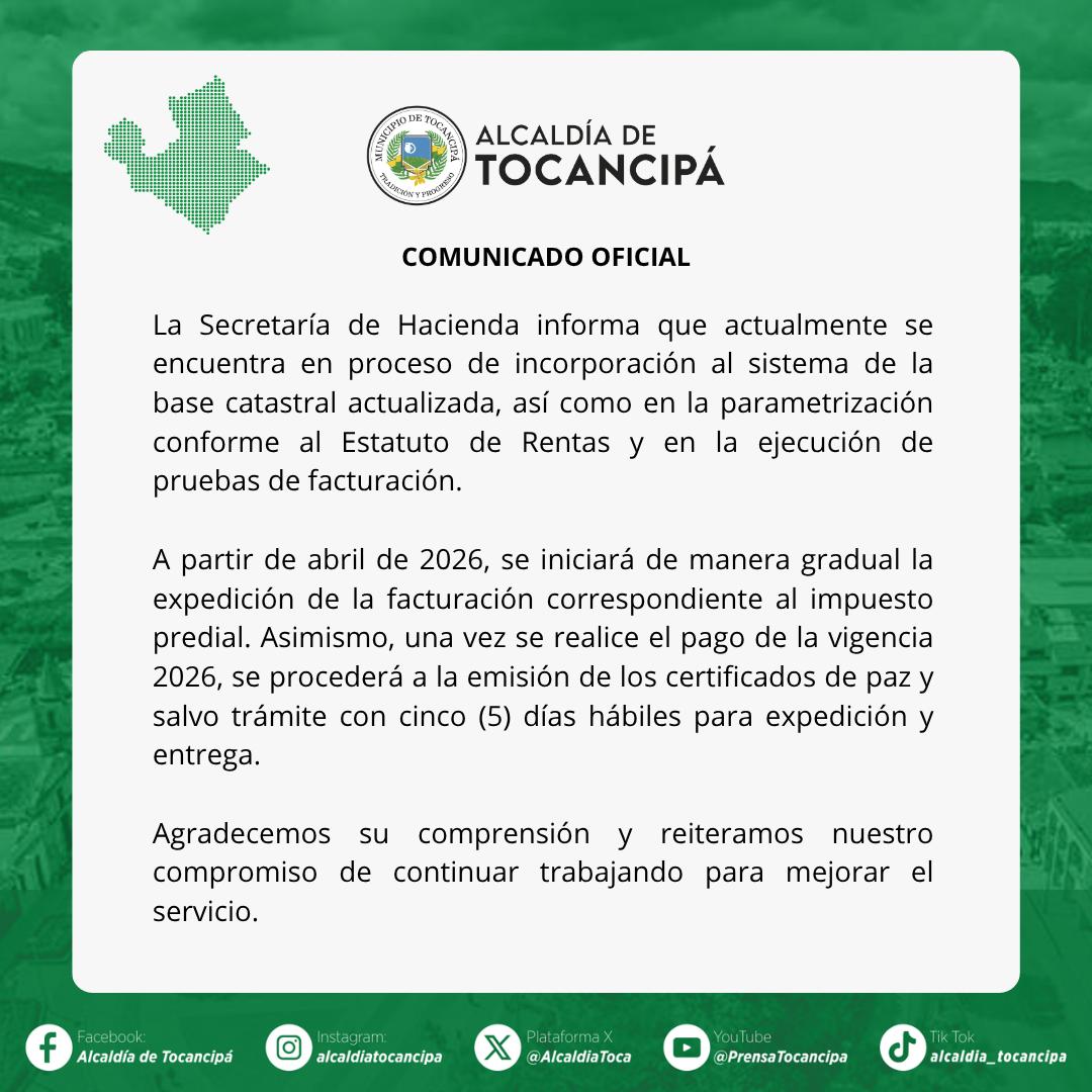 #Hacienda | ¡Atención, tocancipeños! Les informamos que durante el mes de abril iniciará, de manera paulatina, la emisión de las facturas del Impuesto Predial Unificado 2026.