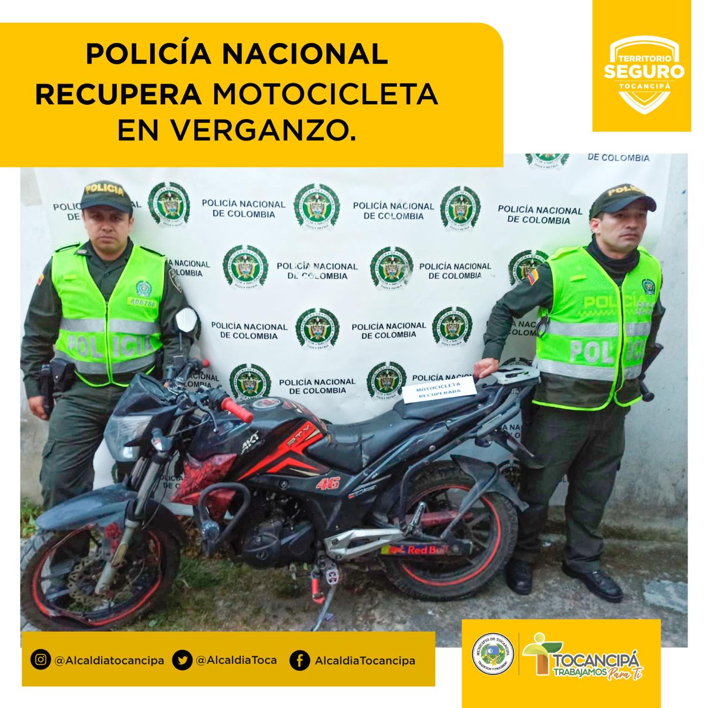 Efectivos de la Policía Nacional recuperan una motocicleta en inmediaciones de la urbanización Torres de San Juan, vereda Verganzo del municipio de Tocancipá.