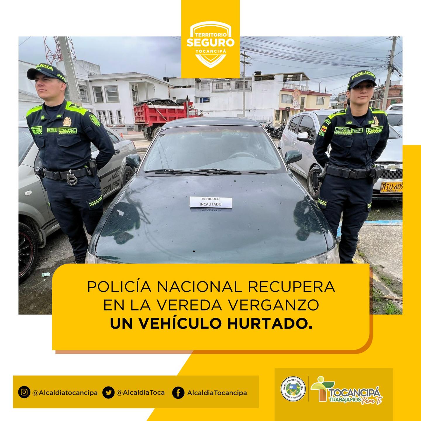 La semana anterior, efectivos de la Policía que se encontraban en la vereda Verganzo, sector Gómez, realizando labores de registro y solicitud de antecedentes de automotores, hallaron un vehículo tipo automóvil marca Kia que se encuentra relacionado en las bases de datos de la Fiscalía General de la Nación y de la misma Policía como robado.