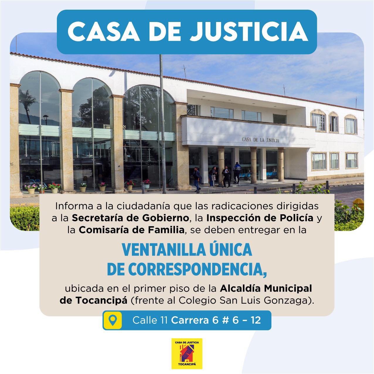 #CasaDeJusticia I Informamos a la ciudadanía en general que las radicaciones dirigidas a la Secretaría de Gobierno, la Inspección de Policía y la Comisaría de Familia, se deben entregar en la Ventanilla Única de Correspondencia, ubicada en el primer piso de la Alcaldía Municipal (ingreso, frente al Colegio San Luis Gonzaga) Calle 11 Carrera 6 # 6 – 12.