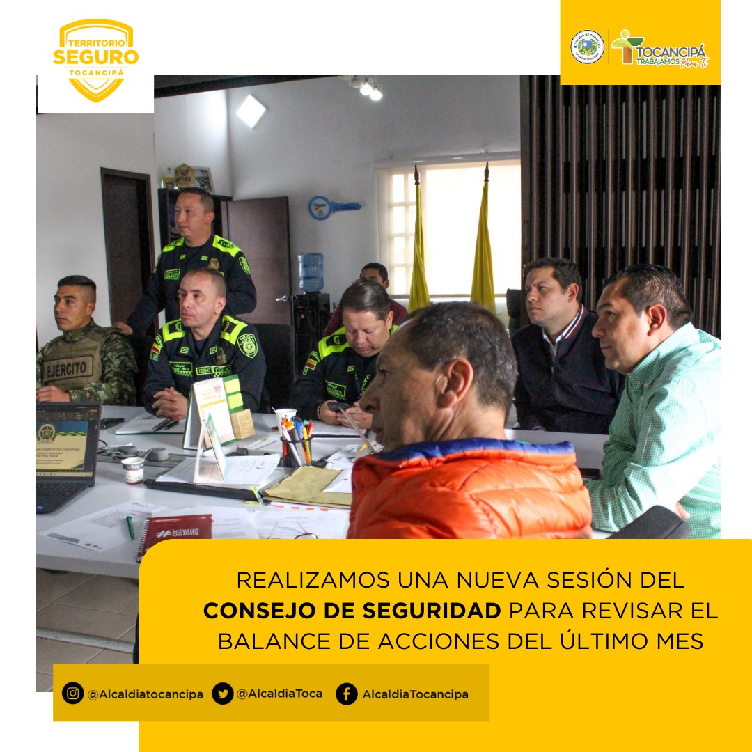 Realizamos una nueva sesión del Consejo de Seguridad liderado por nuestro alcalde Andrés Porras, en el que se entregó un balance de las acciones realizadas en Tocancipá por los organismos de seguridad como operativos de registro y control, casos de delitos, capturas, recuperación de elementos, investigaciones, campañas de prevención en diferentes sectores y demás temas de orden público y convivencia ciudadana en el municipio.