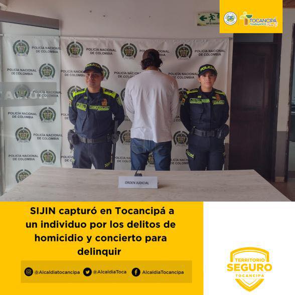 Personal de la SIJIN de la Policía capturó en Tocancipá a un sujeto con orden de captura vigente expedida por el Juzgado Penal Municipal Ambulante con funciones de control de garantía 1 de Sincelejo, por los presuntos delitos de homicidio y concierto para delinquir.