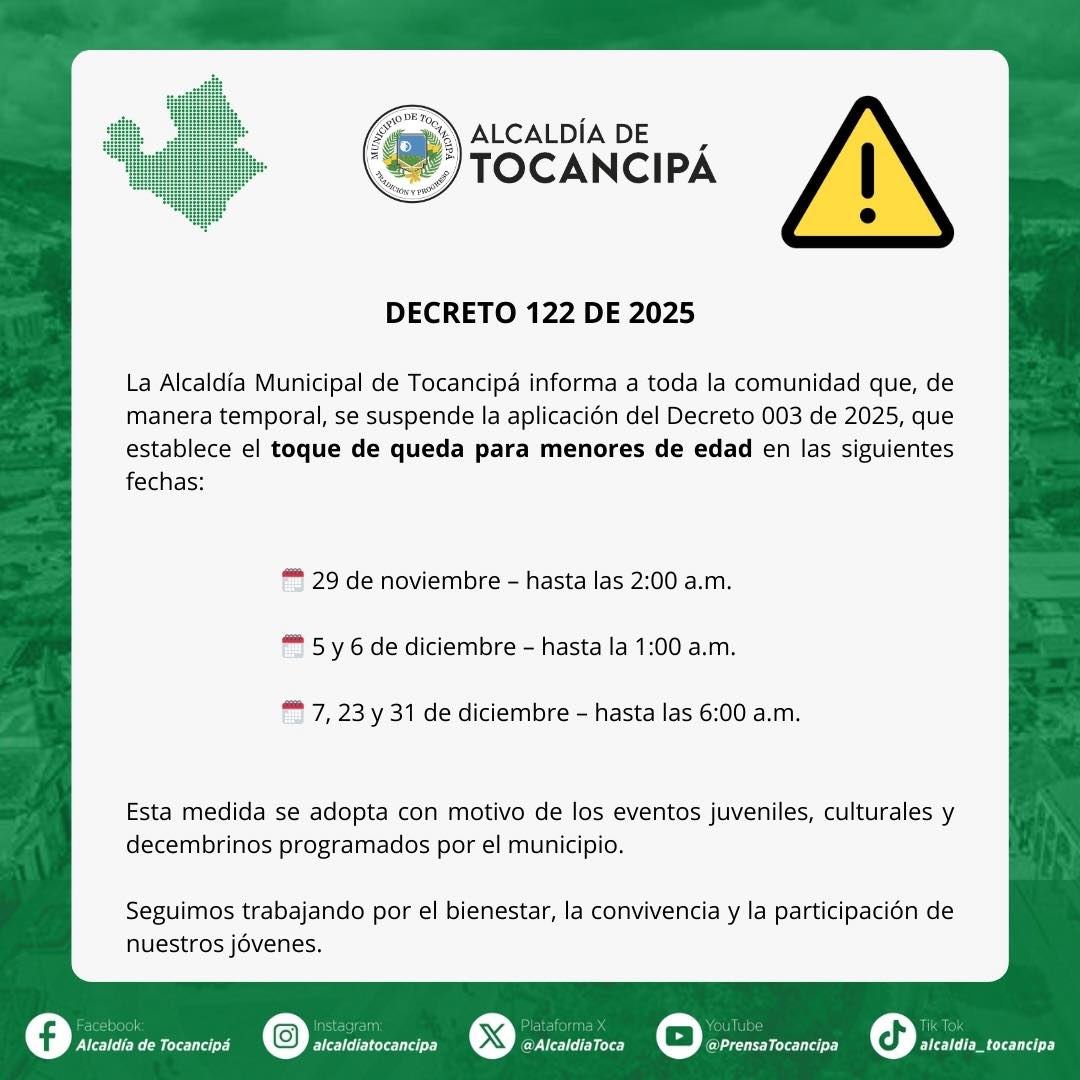#Gobierno | Mediante el Decreto 122 de 2025, se suspenden temporalmente los efectos del toque de queda para menores de edad únicamente en las siguientes fechas:
