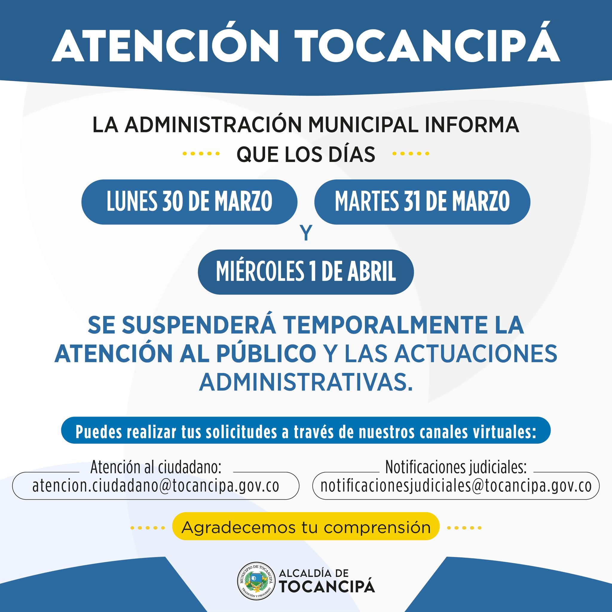 #Administrativa | Mediante el Decreto 024 de 2026, informamos que se suspende temporalmente el servicio y las actuaciones administrativas de la Alcaldía de Tocancipá los días 30, 31 de marzo y 1 de abril de 2026.