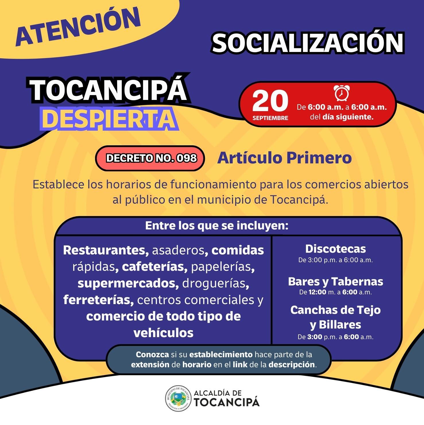 #TocancipáDespierta | Este 20 de septiembre, únete a la jornada que impulsa nuestra economía local con la extensión de horarios para los establecimientos de comercio.