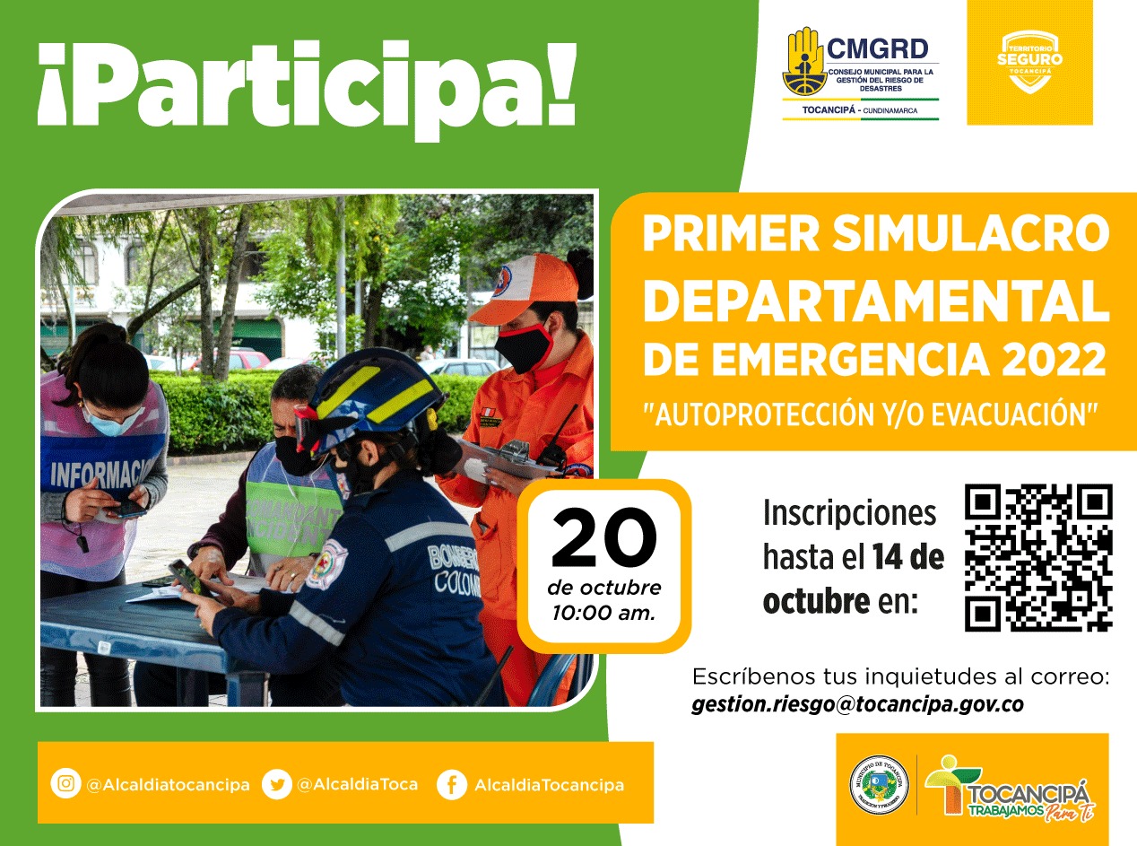 Con el propósito de prevenir emergencias, ante un sismo fuerte o cualquier eventualidad, el pasado 20 de octubre las empresas privadas, organizaciones sociales, entidades, juntas de acción comunal, colegios, conjuntos residenciales, la Alcaldía de Tocancipá, Indeportes Tocancipá, la Empresa de Servicios Públicos de Tocancipá Concejo Municipal de Tocancipá y la Personería Municipal de Tocancipá