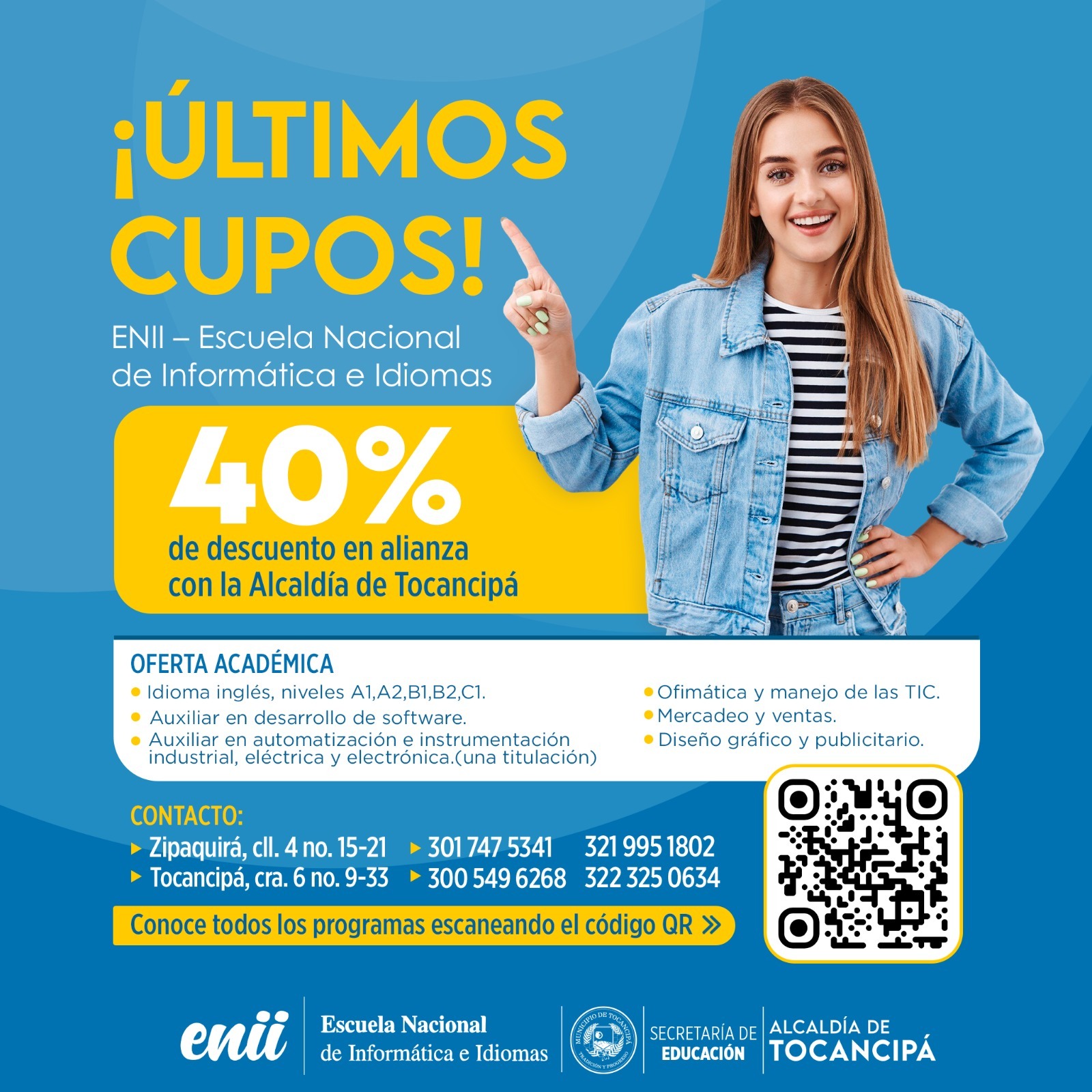 #Educación | ¡ÚLTIMOS CUPOS DISPONIBLES! Aprovecha el 40% de descuento en los programas de la ENII – Escuela Nacional de Informática e Idiomas, gracias a la alianza con la Alcaldía de Tocancipá.