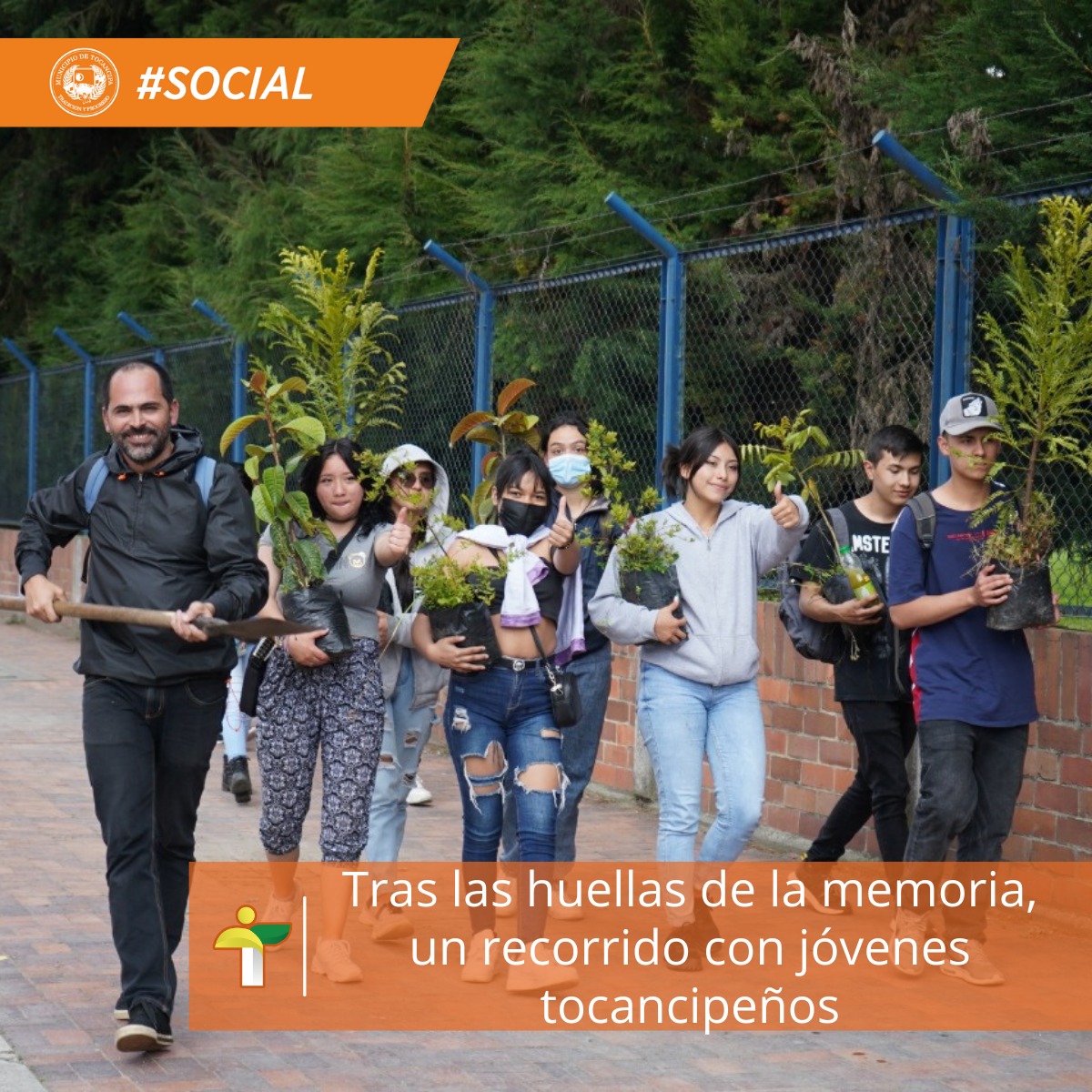 Jóvenes de Tocancipá participaron de 𝐓𝐫𝐚𝐬 𝐥𝐚𝐬 𝐇𝐮𝐞𝐥𝐥𝐚𝐬 𝐝𝐞 𝐥𝐚 𝐌𝐞𝐦𝐨𝐫𝐢𝐚, una caminata que inició en la Casa de la Juventud y culminó con una siembra de árboles en la Quebrada Los Manzanos.