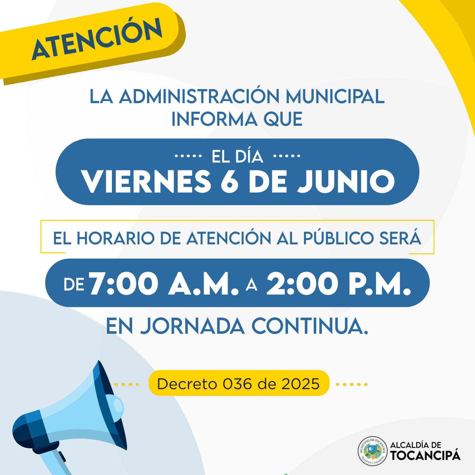 #Administrativa | La Administración Municipal informa a la ciudadanía que este viernes 6 de junio se modifica la atención al público en la Alcaldía de Tocancipá y en las demás sedes administrativas, de acuerdo con el Decreto 036 de 2025.