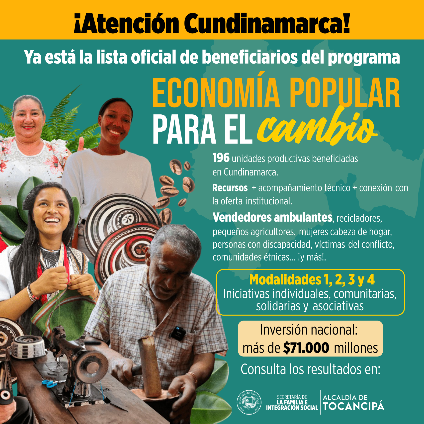 Consulta los resultados en el siguiente link: https://economiapopular.prosperidadsocial.gov.co/ y también en los canales oficiales de la Secretaría de la Familia e Integración Social y la Alcaldía de Tocancipá.